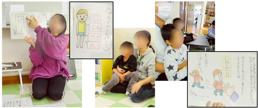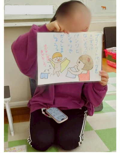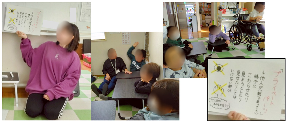 当日は、担当スタッフが作成した教材を使い、「プライベートパーツ」「パーソナルスペース」について、話をしています。